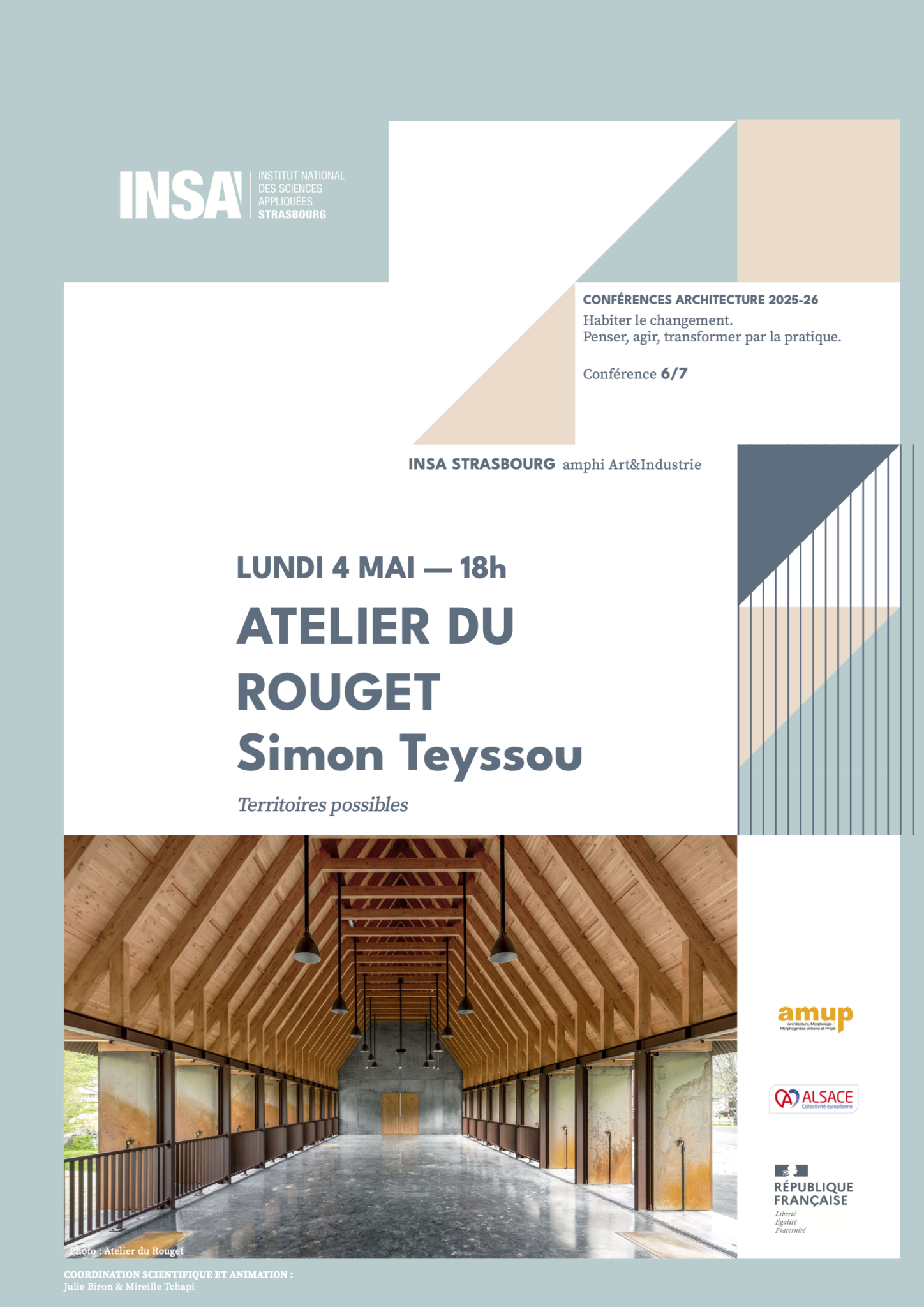 Territoires possibles Depuis plus de vingt ans, l’Atelier du Rouget développe une démarche patiente au cœur des territoires en marge et de la ruralité. Ses projets sont de natures et d’échelles multiples, à l’image de ces milieux habités, eux-mêmes extrêmement contrastés : logements individuels et collectifs, équipements culturels et sportifs, plans guides, infrastructures, mobiliers… À partir de ces expériences répétées et singulières, conjuguées à un approfondissement théorique soutenu, se dégagent quelques principes qui, loin de se présenter comme des règles rigides, apparaissent bien plutôt en filigrane des projets. Le principe d’attachement d’abord, qui renvoie aux milles liens dont sont tissés les milieux habités et dont il est urgent de veiller à la préservation, voire à la régénération. Le principe du possible, élément essentiel de tout projet conscient de l’imprévisibilité. Le principe de la durée enfin, si crucial à notre époque marquée par une crise écologique sans précédent, qui s’incarne dans une attention au temps long, à la maintenance et à la transmission d’un précieux héritage humain. Ces trois fils rouges de l’attachement, du possible et de la durée composeront la trame de la conférence.