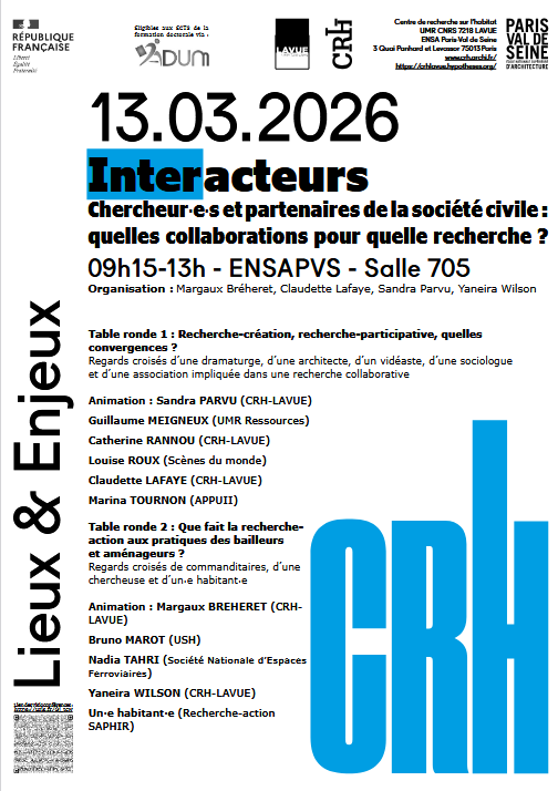 Événements, Recherche Lieux & enjeux #2 – Interacteurs. Chercheur.e.s et partenaires de la société civile : quelles collaborations pour quelle recherche ? – 13 mars 2026 – ENSA Paris-Val de Seine Posted on 18 février 202618 février 2026 Categories Événements Recherche