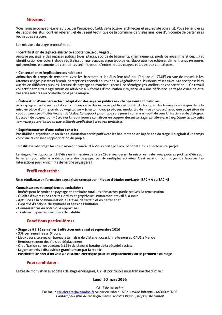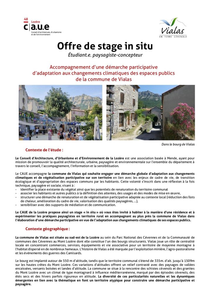 Offre de stage/emploi Offre de stage – Accompagnement d’une démarche participative d’adaptation aux changements climatiques des espaces publics de la commune de Vialas – CAUE de la Lozère (48) Posted on 17 mars 202617 mars 2026 Categories Offre de stage/emploi
